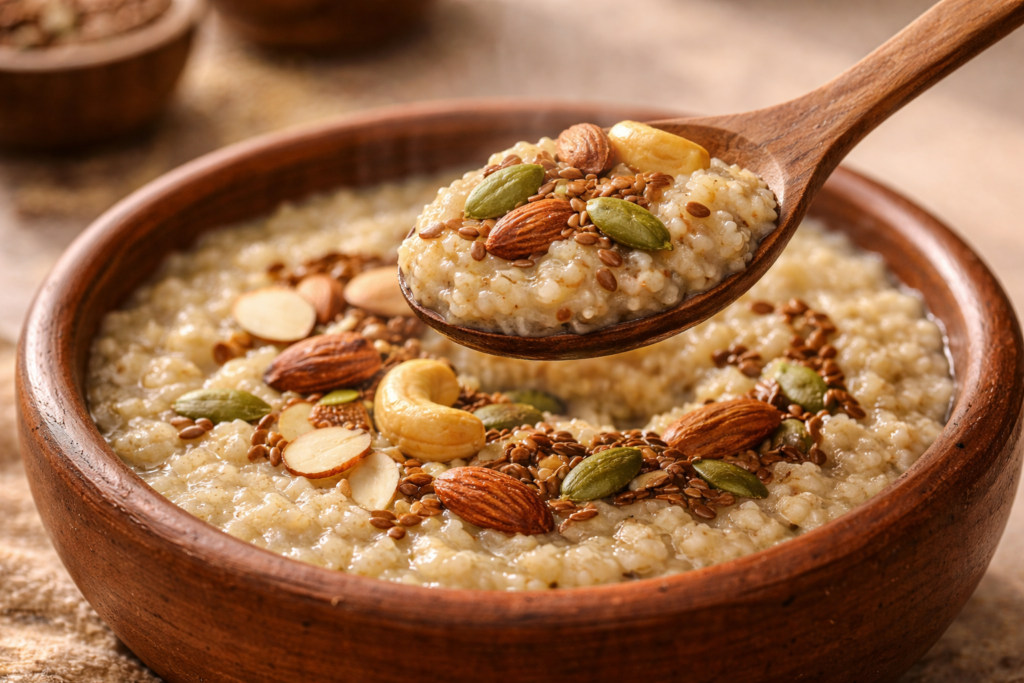 Millets have always been part of Indian kitchens. Ragi porridge, thinai kanji, bajra lapsi — these aren’t new ideas at all. Millet porridge fits daily eating habits because it feels normal, not forced or trendy. It works with Indian spice profiles, salt-based versions, or lightly sweet bowls. Busy mornings need food that cooks fast and digests well. This porridge does both without extra effort. It suits elders, kids, office-goers, and people who eat early and travel long hours. Many notice less heaviness compared to refined grain breakfasts. That small comfort adds up over time. Add nuts and seeds and the meal feels complete. No side dishes needed, no extra planning.